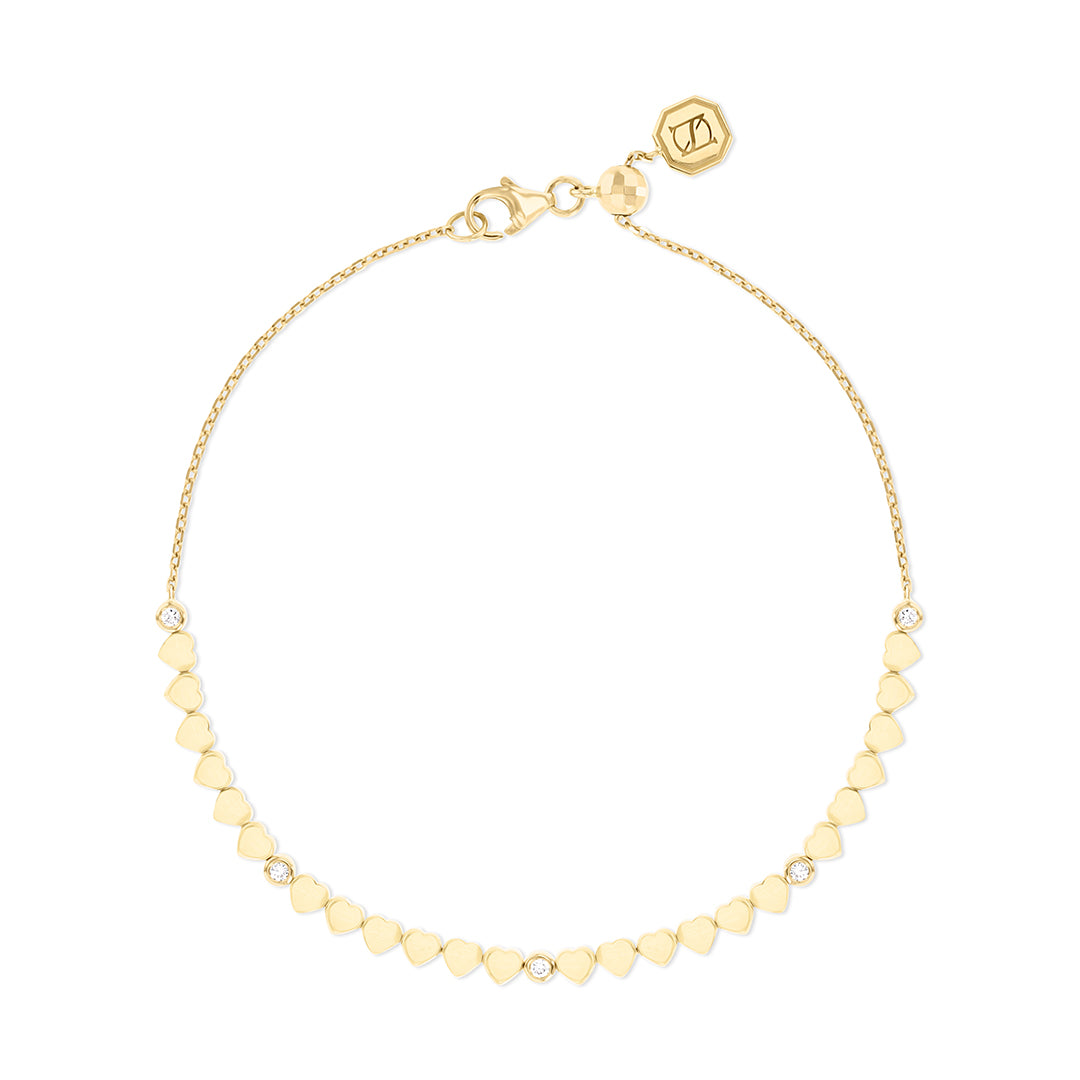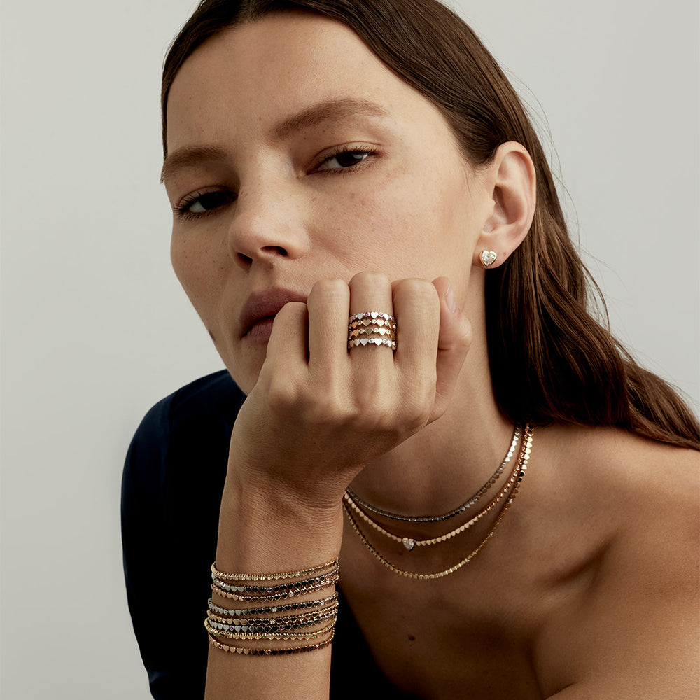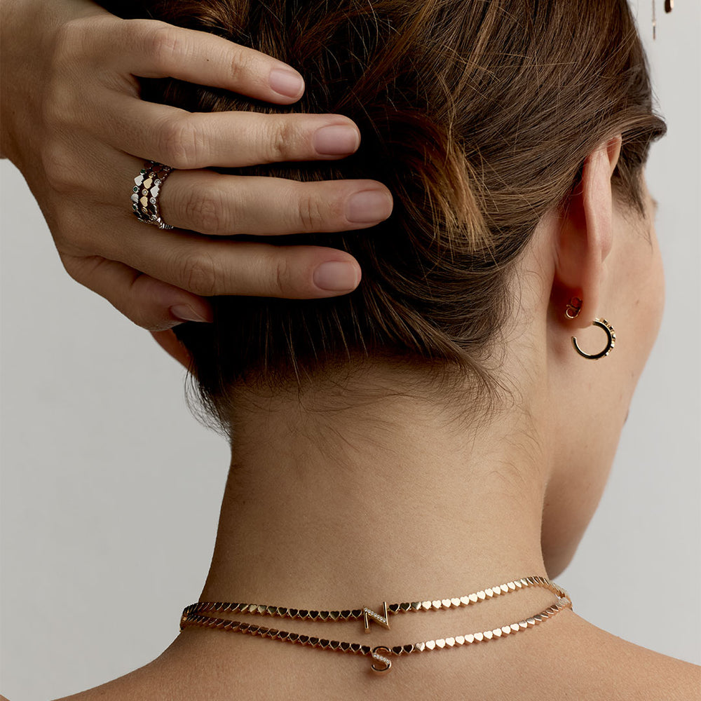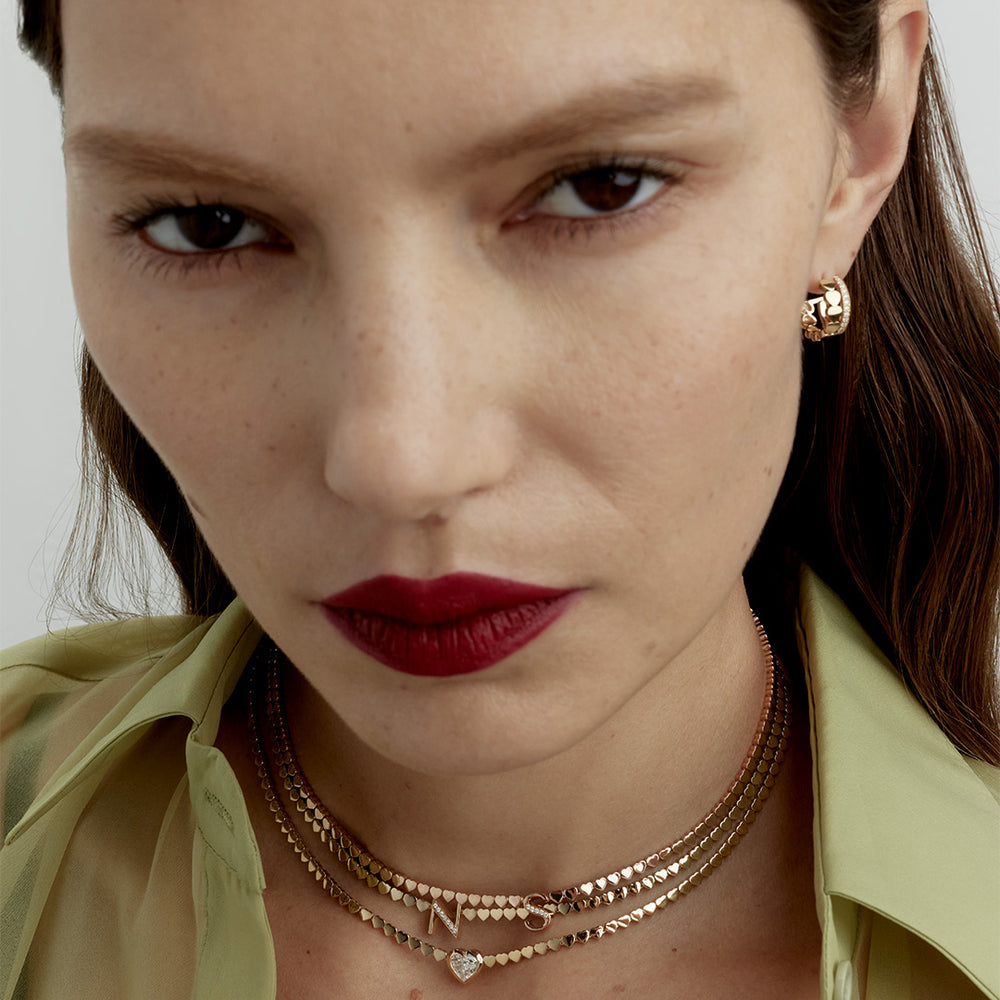 The Love in Tokyo collection by Noora Shawqi is a special capsule launched in dedication to the Japan collection. It celebrates the spirit of love through delicate 18k gold designs featuring small heart motifs. The collection includes a variety of sequences, with pieces adorned with diamonds, vibrant gemstones, and a customizable initials concept.