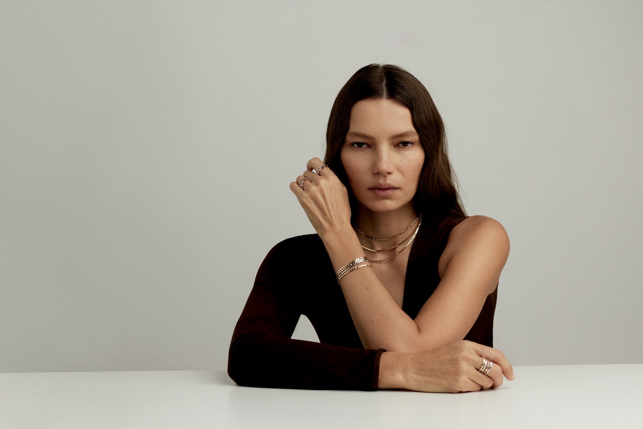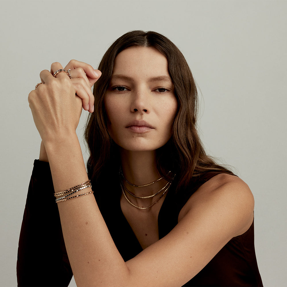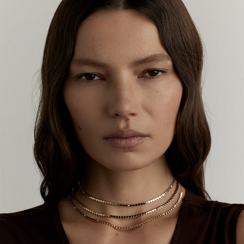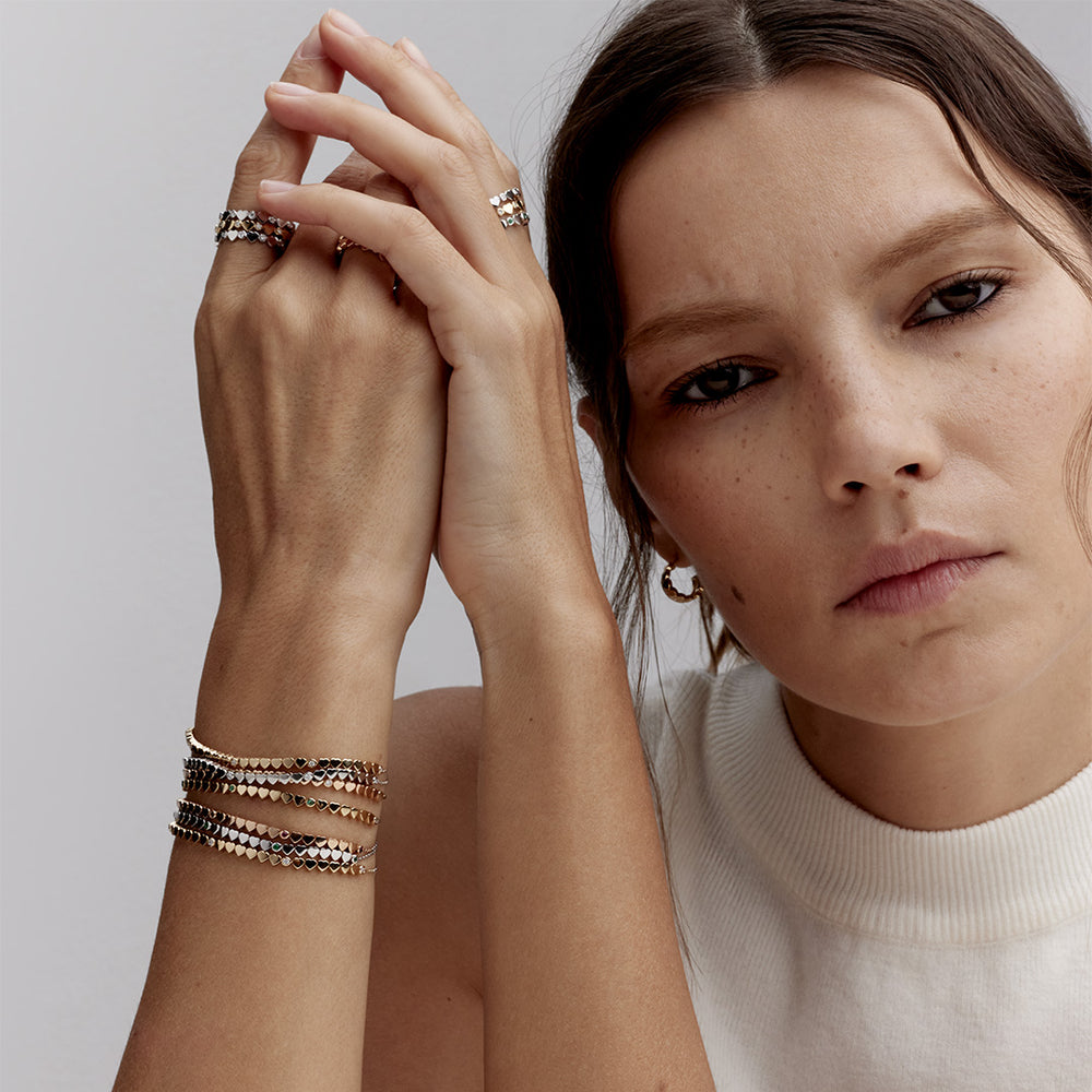 The Love in Tokyo collection by Noora Shawqi is a special capsule launched in dedication to the Japan collection. It celebrates the spirit of love through delicate 18k gold designs featuring small heart motifs. The collection includes a variety of sequences, with pieces adorned with diamonds, vibrant gemstones, and a customizable initials concept.